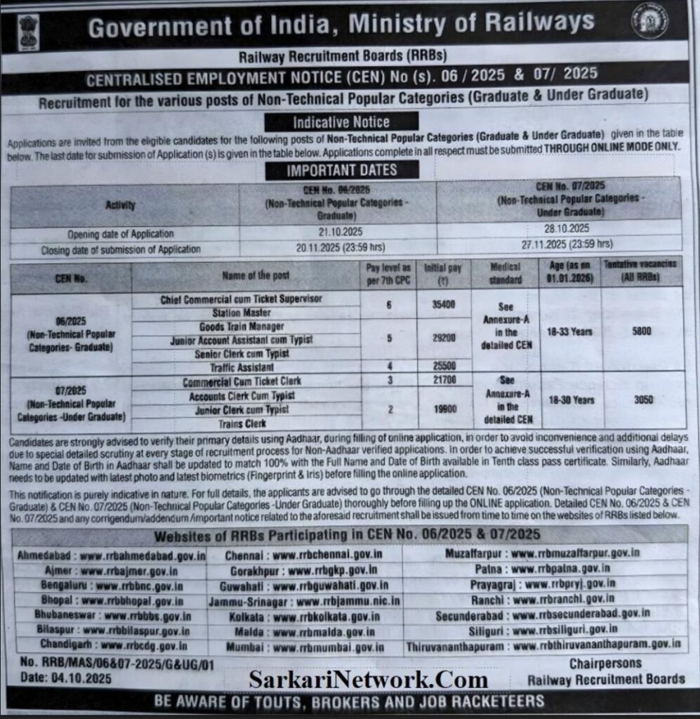 RRB NTPC 12th Level Recruitment 2025 : The Railway Recruitment Board (RRB) has released the official notification for RRB NTPC Under Graduate Level Recruitment 2025 (CEN 07/2025). This recruitment drive offers 3058 vacancies for Class 12th pass candidates across India.